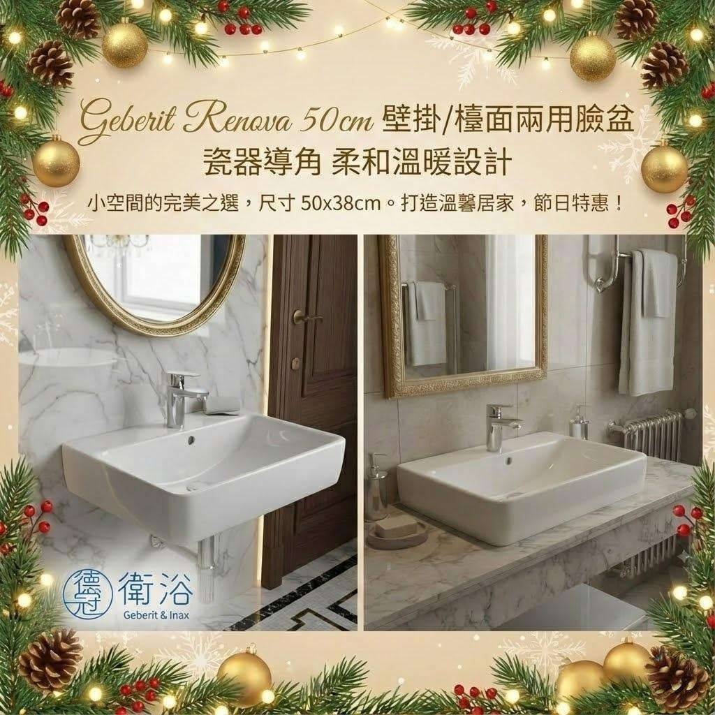 臉盆: Geberit Renova 50cm (德國原裝,可壁掛/檯面/搭浴櫃)